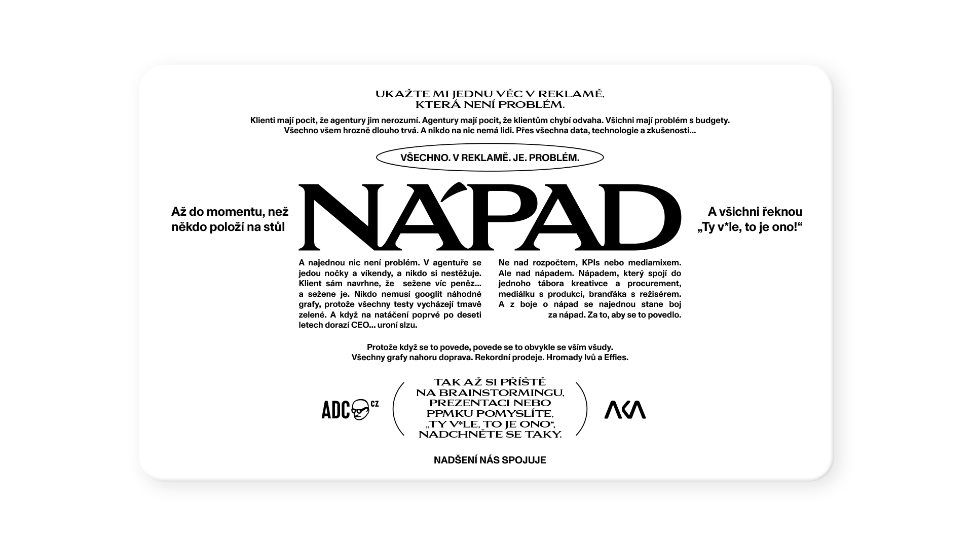 Kampaň Síla nápadu vychází z jednoduché, ale dnes velmi aktuální otázky: jaký prostor dáváme nápadům, které mohou mít skutečný dopad? V době tlaku na výkon, rychlost, cenu a optimalizaci chtějí AKA a ADC připomenout, že právě silný nápad je často tím momentem, který propojí strategii i kreativitu a doručí výsledky. A v praxi se projevuje tehdy, když je opřený o porozumění problému a jasný záměr.